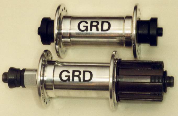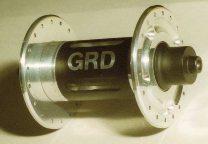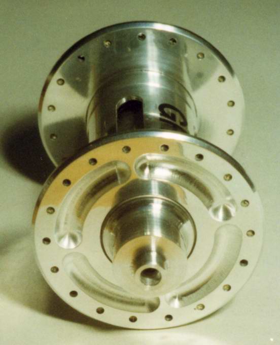 Von Anfang an lag den Vorderradnaben die Idee zugrunde, statt einer dünnen 9mm Stahlachse lieber eine Aluminiumachse großen Durchmessers (17mm) zu verwenden, um eine höhere Steifigkeit zu erreichen. Zur Minimierung des Gewichtes waren die Achsen dann entsprechend dünnwandig, so daß eine Vorderradnabe mit kleinen Flanschen ein Gewicht von lediglich 120 Gramm hatte.