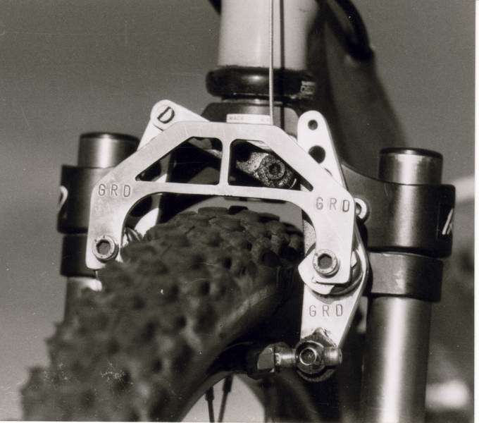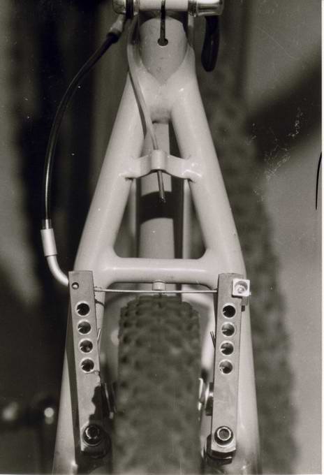 Deshalb habe ich 1990 als Lösung eine Bremse mit Linearer Zugführung entwickelt, die schon die meisten Merkmale einer heutigen sog. V-Brake hatte: Ein Umlenkrohr mit Teflonröhrchen und lange Bremsfedern, die sich am Bremsarm abstützen. Ab Modelljahr ´94 gab es dann den AntiTwist-Adapter, der die Bremsklötze näher an die Gabel rückte und für weniger Verwindung bei Federgabeln sorgte. Auch das ist heute Standard.