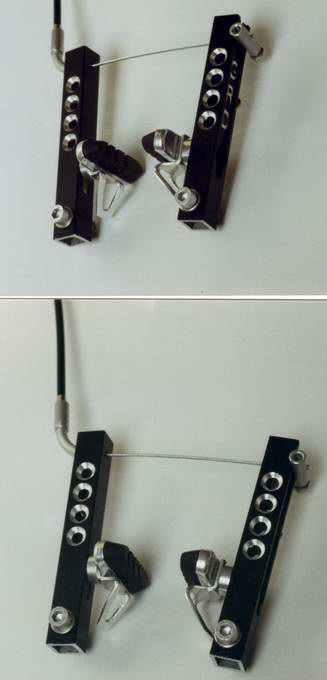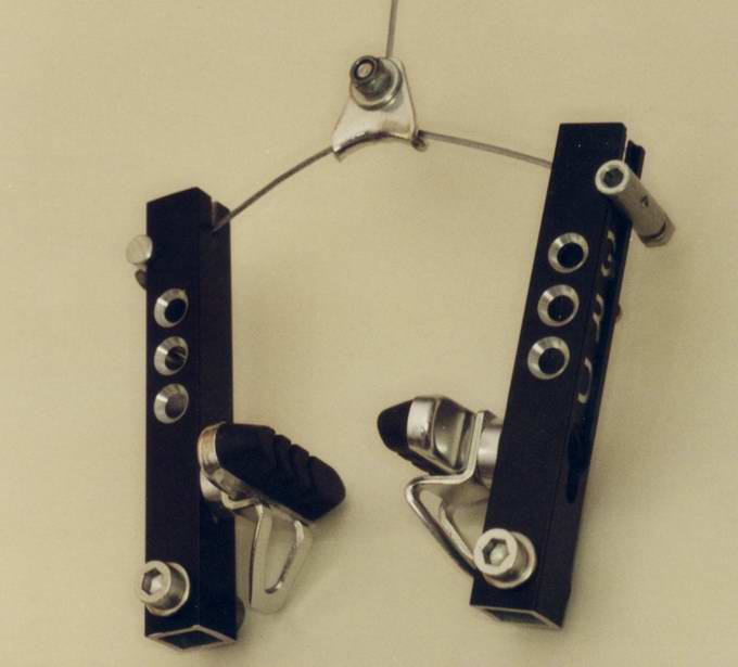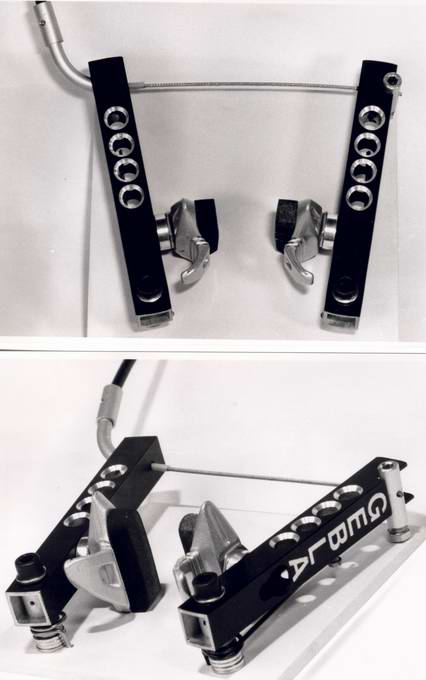 Die ersten GEBLA Straight Stop Bremsen ab ´89 waren allerdings normale Cantileverbremsen mit Querzug und Seildreieck. Nach wenigen Prototypen aus massivem Material habe ich auf das wesentlich leichtere rechteckige Aluminiumrohr umgestellt. So konnte das Gewicht inklusive Querzug, Seildreieck und Bremsbelägen schon in der Standardversion unter 145 Gramm liegen. Die verschiedenen besonders leichten SL-Versionen haben das Gewicht bis auf rund 110 Gramm gedrückt. Das Rechteckrohr hatte auch steifigkeits- und festigkeitsmäßig Vorteile. Viele werden sich ja noch an die Quietschprobleme bei den aus dünnem Vollmaterial hergestellten Bremsen erinnern. Allerdings hat die gewöhnungsbedürftige Optik der Bremsarme nicht nur Freunde gefunden :-). Aber gerade bei Bremsen finde ich die bessere Technik wichtiger als die gefälligere Optik, zumal diese sowiso Geschmacksache ist. Beim Bremsentest der Zeitschrift Bike 2/94 haben die GEBLA Straight Stop als Bremsen mit der besten Bremsleistung und Dosierbarkeit abgeschnitten, und das ist ja eigentlich das, was für eine Bremse wichtig ist.