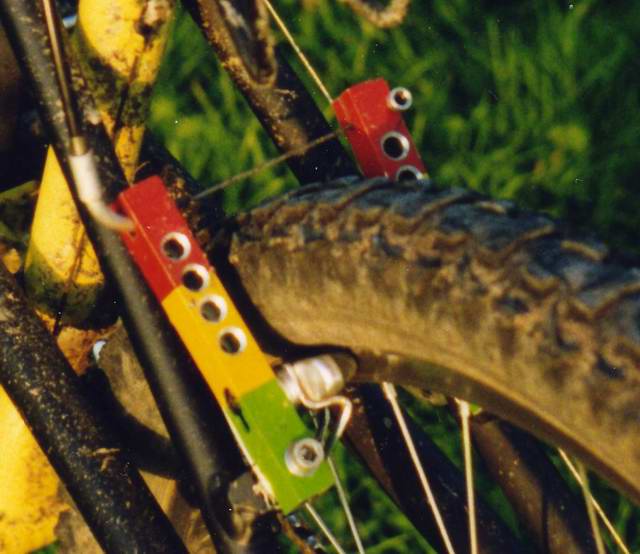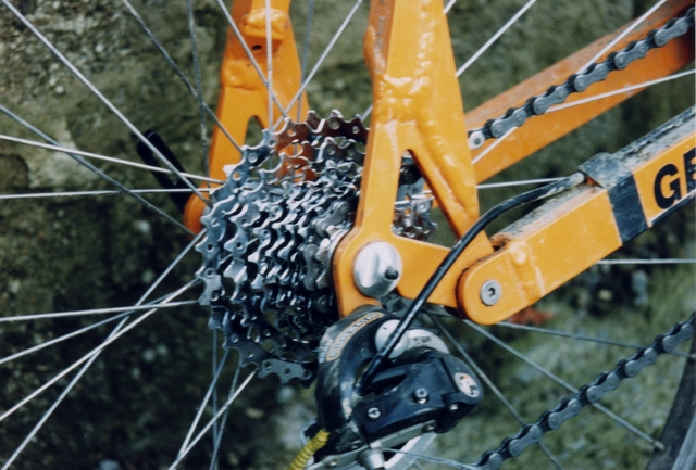 Erstens habe ich lernen müssen, wie viel Kraft der Fahrer über die Kette in den Hinterbau einbringt und wie wichtig ein stabiler Hinterbau ist. Der originale Hinterbau dieses Rahmens hat nur etwa 8 Wochen gehalten, die Fotos zeigen schon die zweite Version. Es gibt leider keine Fotos der ursprünglichen Variante oder des komplett aufgebauten Rades. Heutzutage ist die Konstruktion eines vernünftigen Hinterbaues erheblich einfacher geworden, es gibt nämlich Umwerfer mit untenliegender Klemmschelle (low clamp). Dadurch müssen die Kettenstreben nicht mehr so hoch über den Umwerfer geführt werden, müssen also nicht mehr so einen großen Bogen machen, so daß die Belastung erheblich geringer ist. Auch die heute generell kleineren Kettenblätter erlauben einen geringeren Bogen.