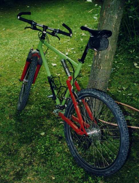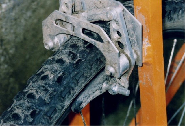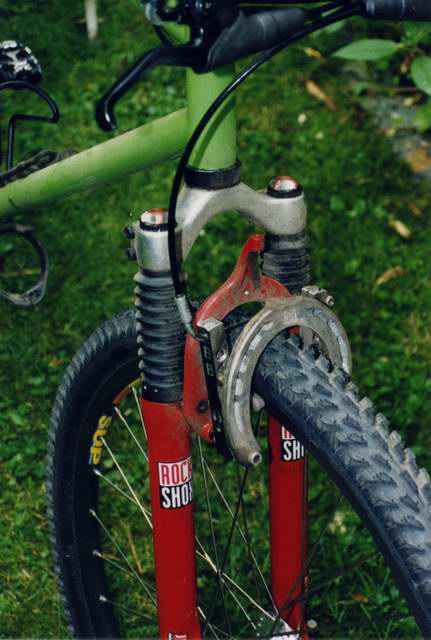 Vom meinem eigenen 1993er Rad existieren gottseidank Fotos, die das Rad komplett zeigen. Klar, daß es mit eigenen Komponenten ausgestattet ist. Bremsen mit linearer Zugführung, heute meist V-Brake genannt, die vordere kugelgelagert. Die Vorderradnabe mit voluminöser, 17mm dicker, Aluminium-Hohlachse, um die Steifigkeit der Federgabel zu erhöhen. Die Federgabel ist eine RockShox MAG21 long travel mit 63mm Federweg, luftgefedert und ölgedämpft. Eine Gabel, die mit einigen Änderungen durchaus vernünftig arbeitet und recht wenig Wartung benötigt. Eine gute Kombination zum Hinterbau.