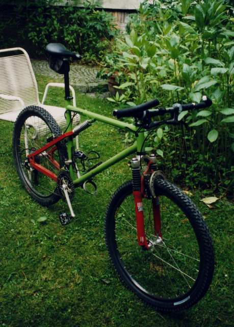 Das Konzept dieses Rades entstand 1996, gebaut wurde es dann im Frühjahr 1997. Damals war das Wort Freeride noch nicht erfunden und die dazugehörige Radgattung der Räder mit Federwegen deutlich über 100mm für normale Touren auch nicht. Deshalb mußte ich auch wieder zu der extremsten Downhillgabel greifen, die erhältlich war, um meine Idee eines solchen Rades zu realisieren.