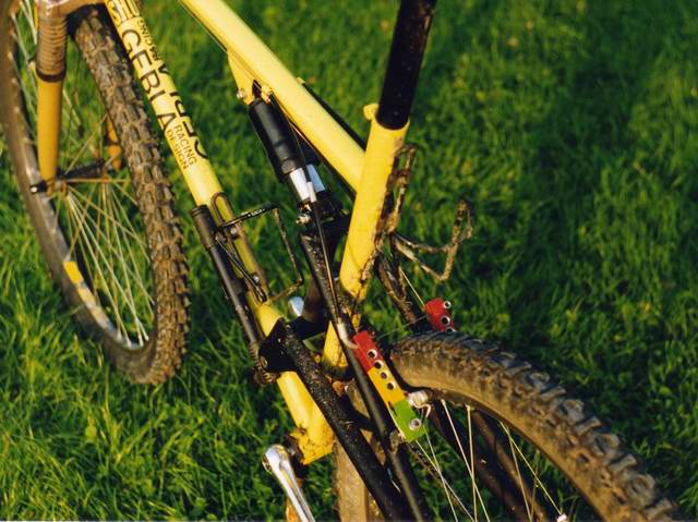Die Federung ist ein sogenannter Eingelenker mit obenliegenden Kettenstreben. Obenliegende Kettenstreben wurden damals gerne verwendet, um die Platzverhältnisse hinter dem Tretlager bei kurzen Kettenstreben zu verbessern. Zudem gab es damals häufiger als heute Kettenklemmer/chainsuck. Bei obenliegenden Kettenstreben konnte man einen Klemmer rechtzeitig merken, so daß die Kettenstrebe nicht beschädigt wurde. Seit ein paar Jahren werden Eingelenker mit obenliegenden Kettenstreben wieder relativ häufig verwendet.