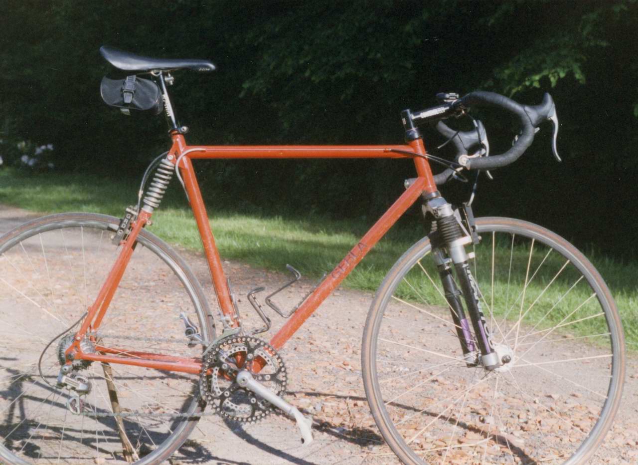 Die Gabel ist eine modifizierte Manitou Mountainbikegabel mit einem auf 30mm reduzierten Federweg. Damals wie heute gibt es keine ausdrückliche Rennradfedergabel. Nur ein paar Jahre lang gab es von Rockshox die Ruby SL, die einzige Rennradfedergabel, die nennenswerte Stückzahlen erreichte und von der Technik als auch von der Optik her akzeptabel war. Eine Handvoll davon besitze ich noch als Neuware. Als einzige wirkliche Alternative zur Ruby SL sehe ich im Moment die Verwendung einer klassischen Stahlgabel an, die von Haus aus einen gewissen Komfort bietet. Das fährt sich kombiniert mit einer Hinterradfederung sehr gut und hat den Vorteil, daß es im Wiegetritt nicht zu spüren ist. Im Wiegetritt ist die Hinterradfederung im Grunde nicht zu spüren, so daß sich ein Rennrad nur mit Hinterradfederung bis auf den Komfort wie ein starres fährt.