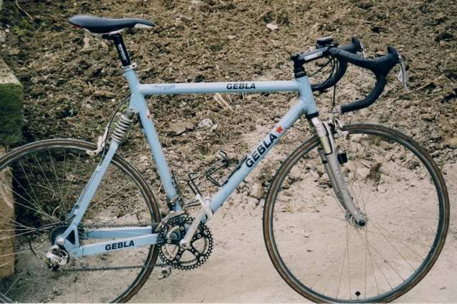 Hier ein gefedertes GEBLA von 1995. Der McPherson Hinterbau gibt dem Rad ein klassisches Aussehen und erlaubt rund 40mm Federweg. Der Rahmen ist aus endverstärkten Columbusrohren muffenlos gelötet, um das Gewicht gering zu halten. Die Rohrdurchmesser sind gegenüber den klassischen Durchmessern gemuffter Rahmen nur leicht vergrößert, um dem Rahmen eine gewisse Lebendigkeit zu erhalten.